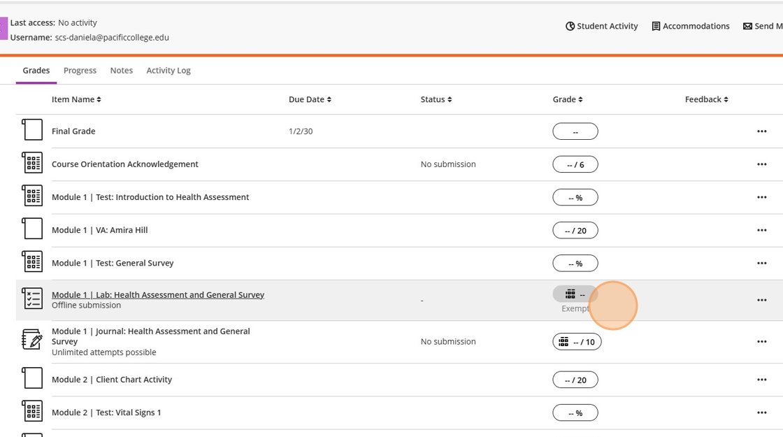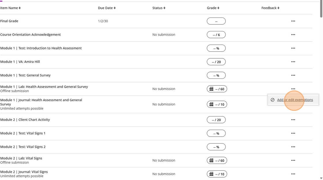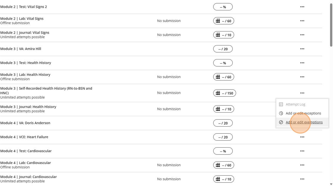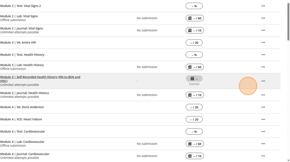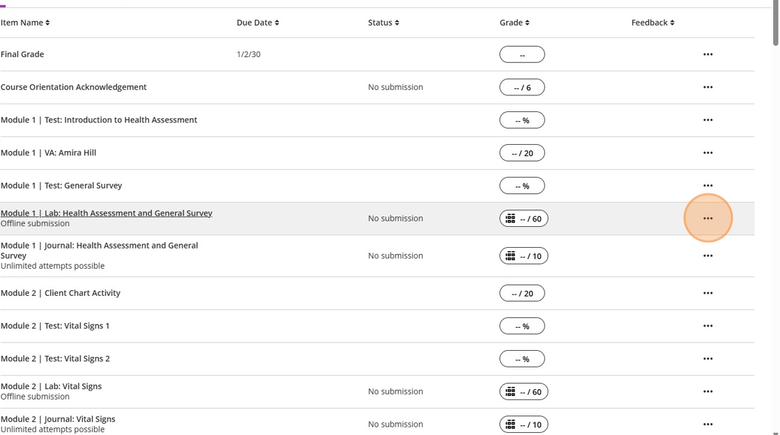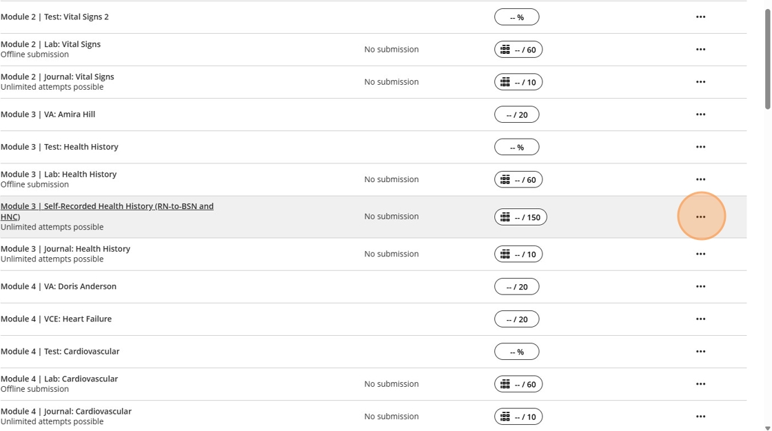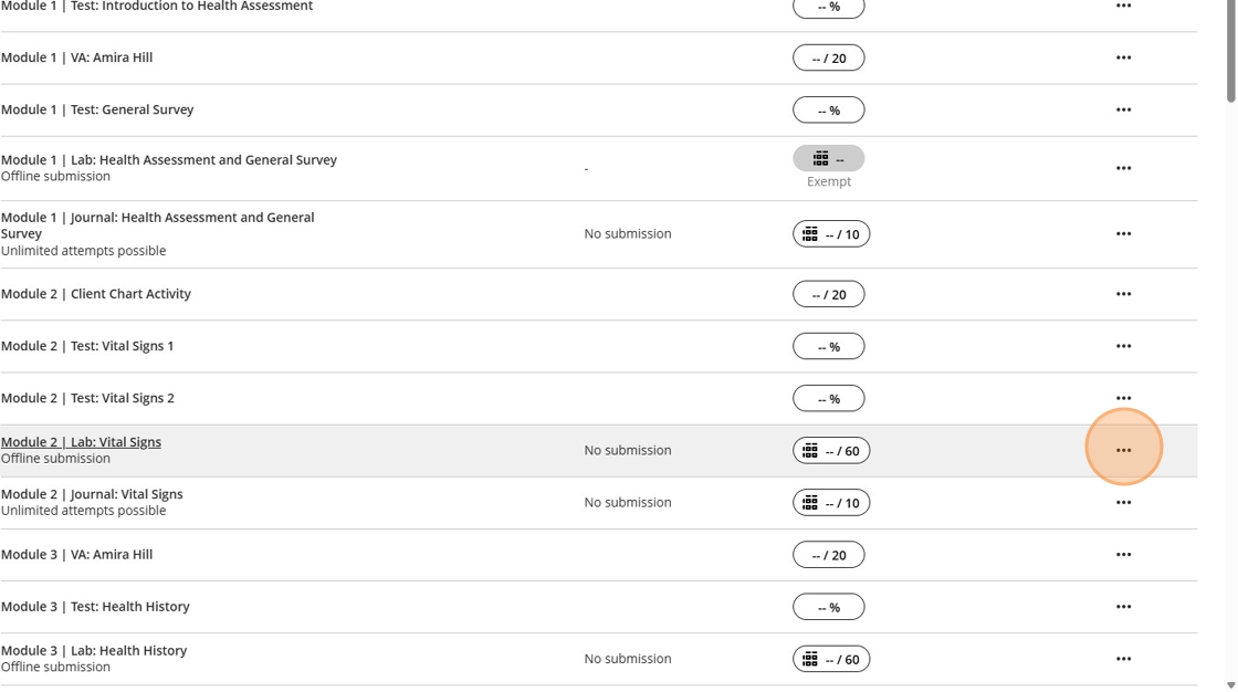 This will display all of the graded items in the course. Since this is an RN-to-BSN student, this student won't be doing the Labs. Click on the ellipsis ("...") icon for the Lab.