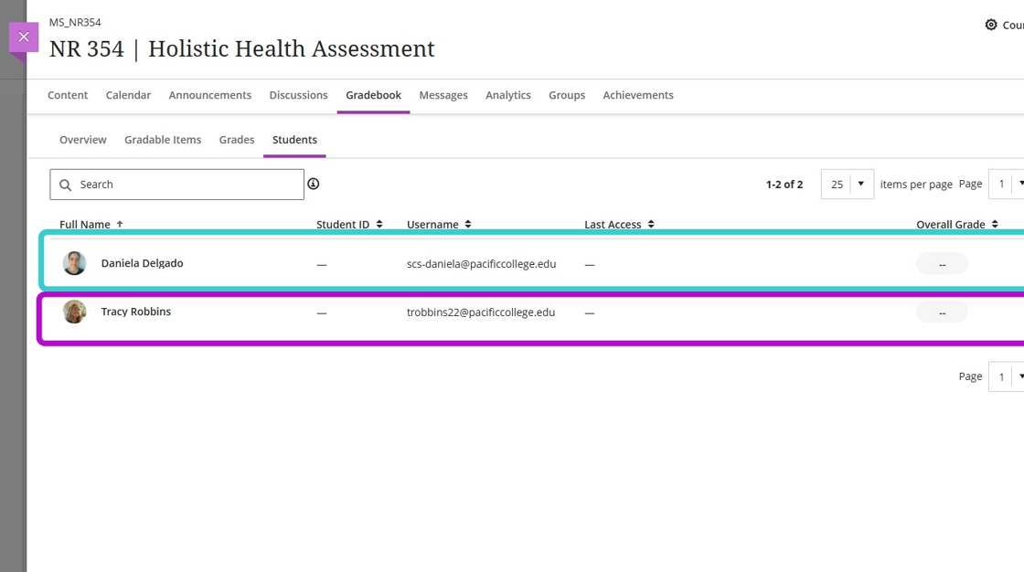Once completed, the first student will see all the lab assignments grayed out in their gradebook, while the second student will see the online assignments grayed out.